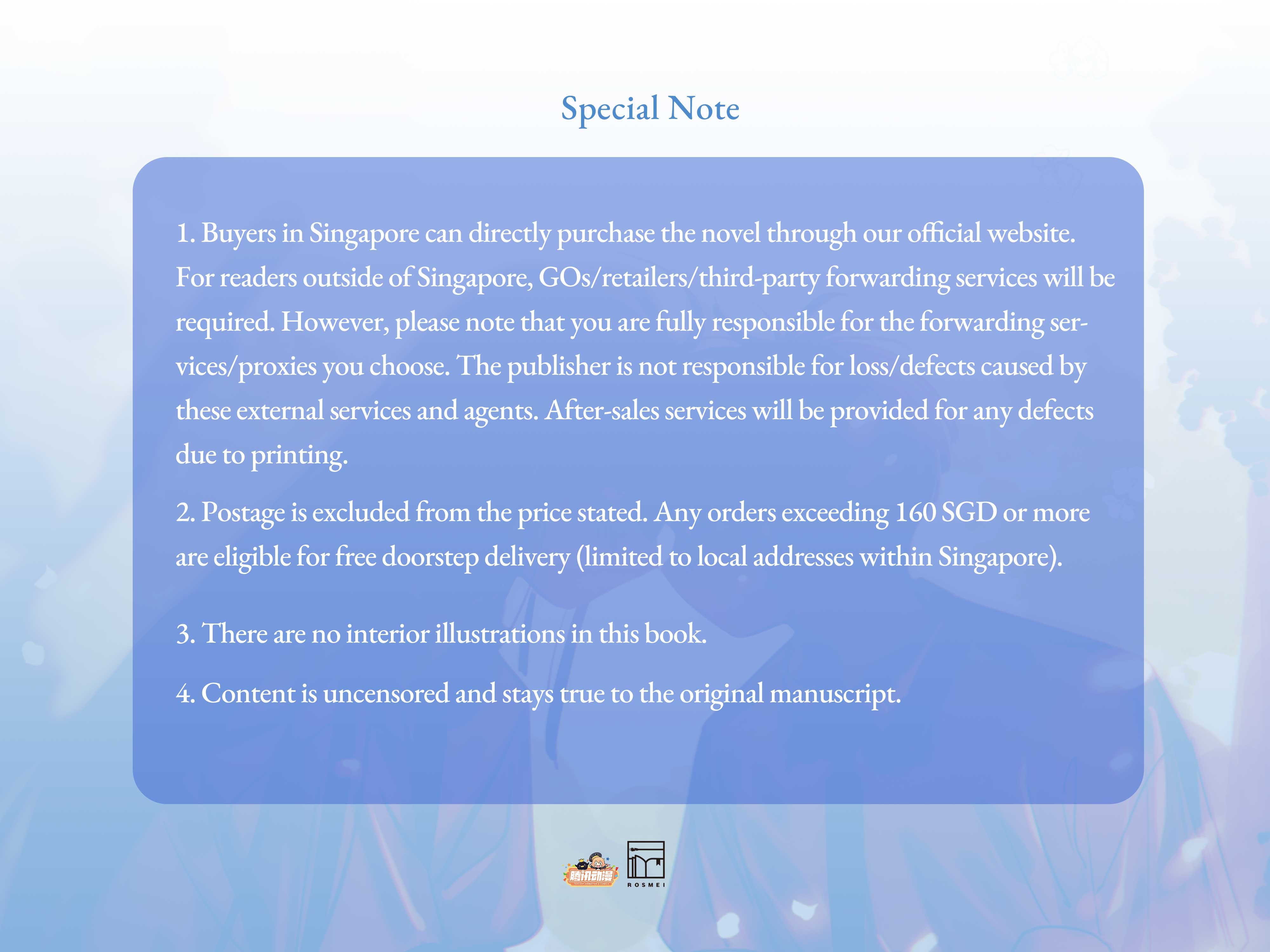 1. Buyers in Singapore can directly purchase the novel through our official website. For readers outside of Singapore, GOs/retailers/third-party forwarding services will be required. However, please note that you are fully responsible for the forwarding services/proxies you choose. The publisher is not responsible for loss/defects caused by these external services and agents. After-sales services will be provided for any defects due to printing.