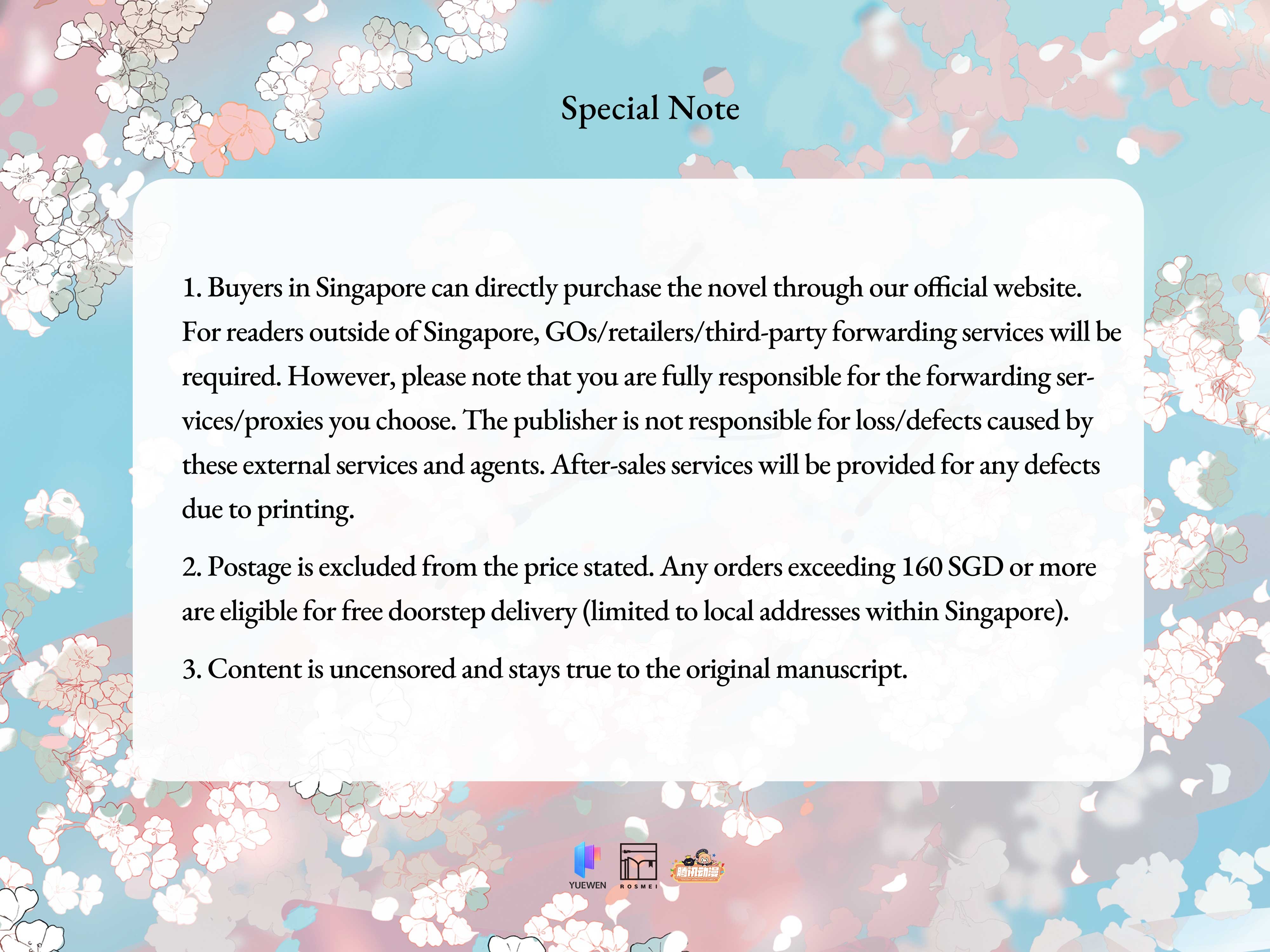1. Buyers in Singapore can directly purchase the novel through our official website. For readers outside of Singapore, GOs/retailers/third-party forwarding services will be required. However, please note that you are fully responsible for the forwarding services/proxies you choose. The publisher is not responsible for loss/defects caused by these external services and agents. After-sales services will be provided for any defects due to printing.